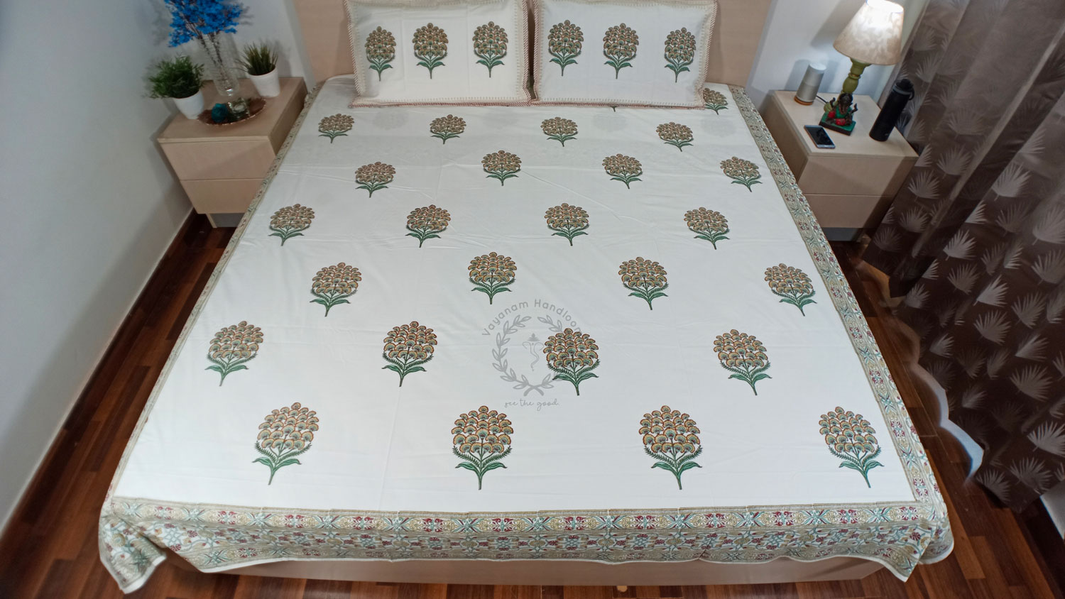 Kausheya Collection-Bedsheet with yellow marigold motifs hand printed with reversible pillow covers
