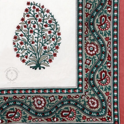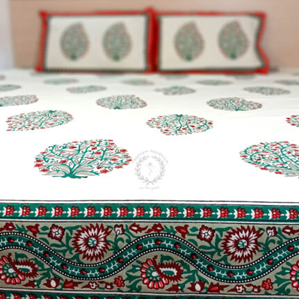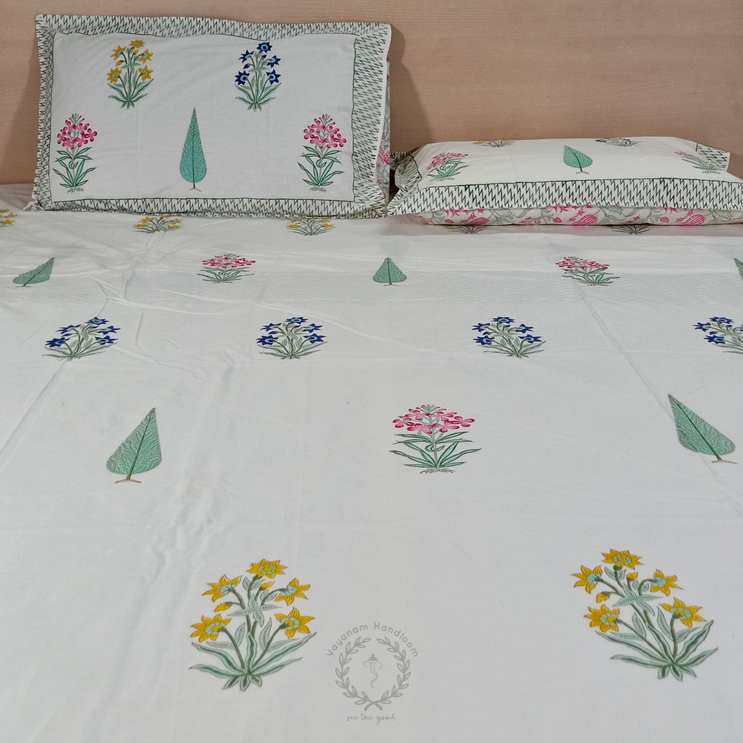 Kausheya Collection-Bedsheet with hand printed beautiful flowers and cypress in colour palatte of blue, pink and green