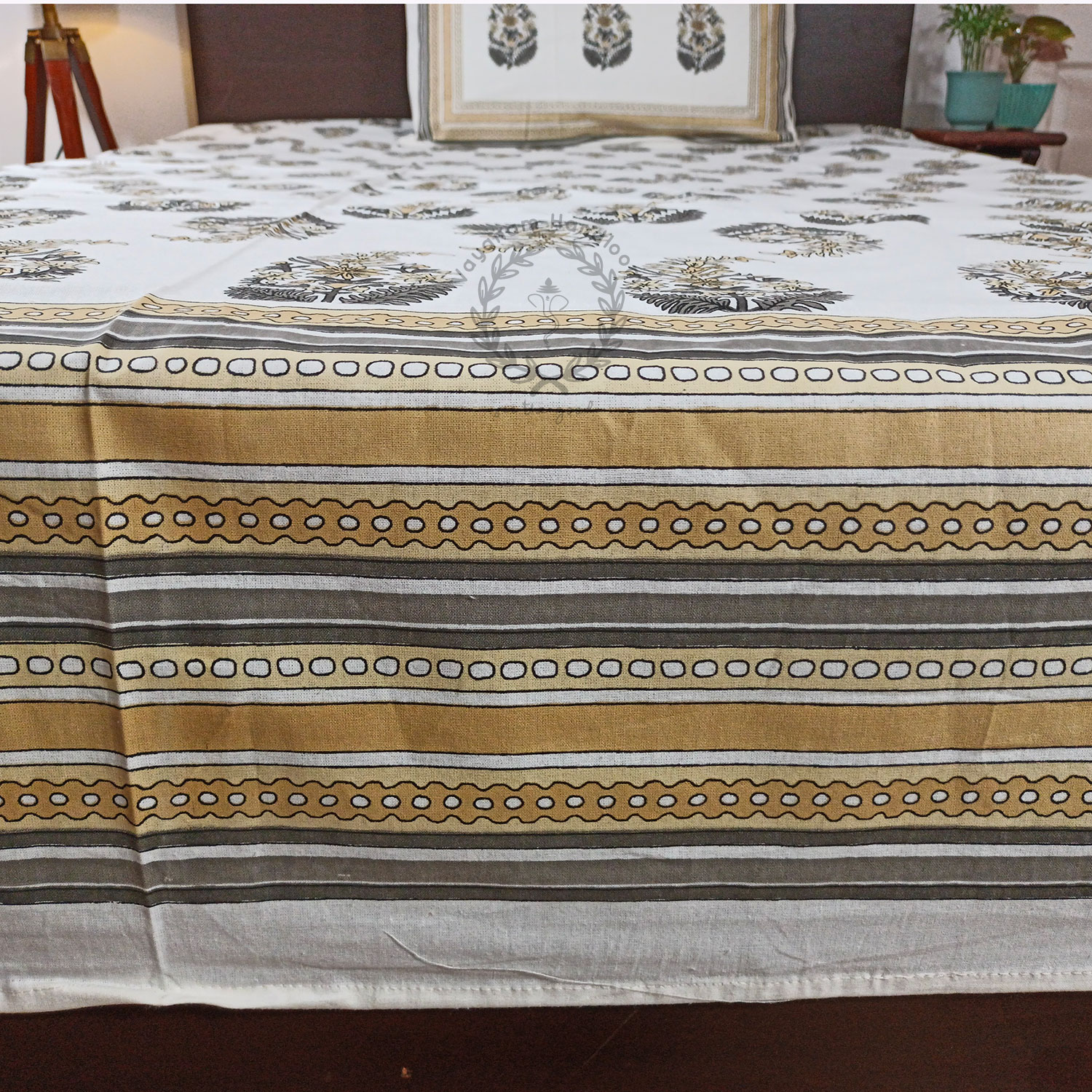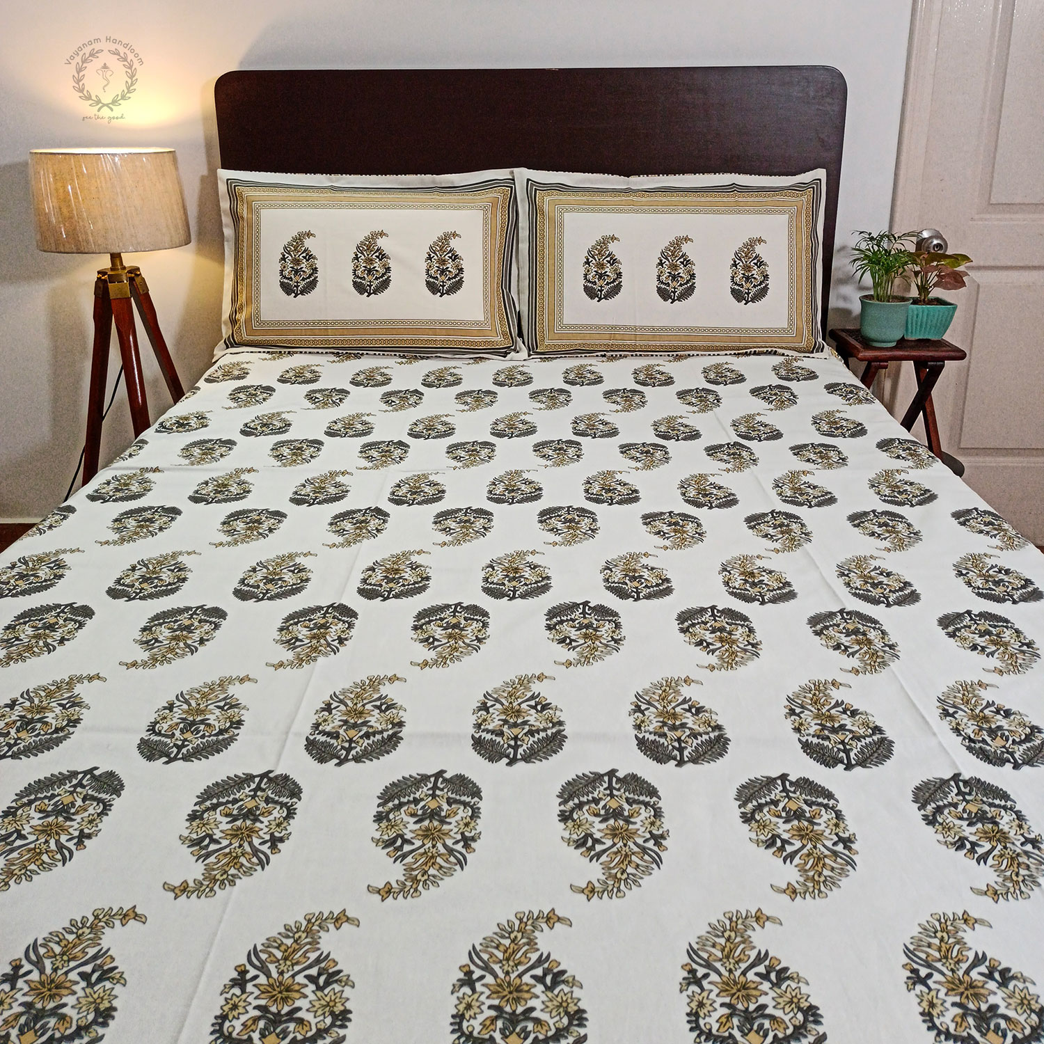 Shudham Collection- Hand block cotton bedsheet in white,grey and yellow paisley motifs