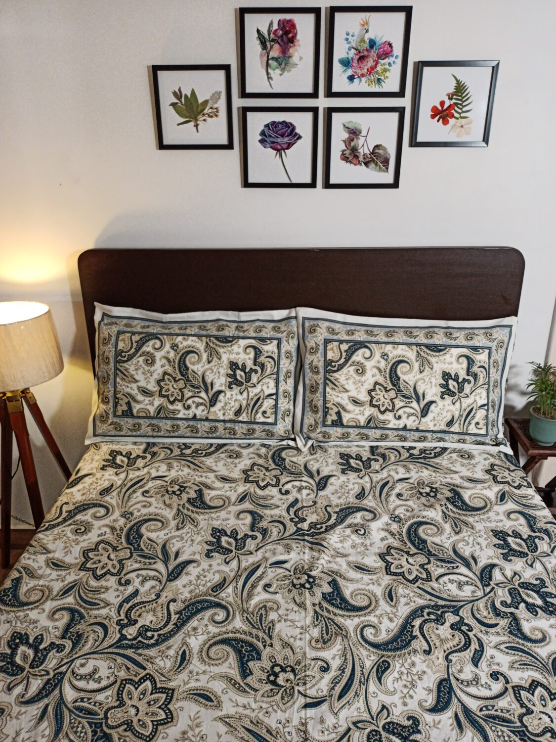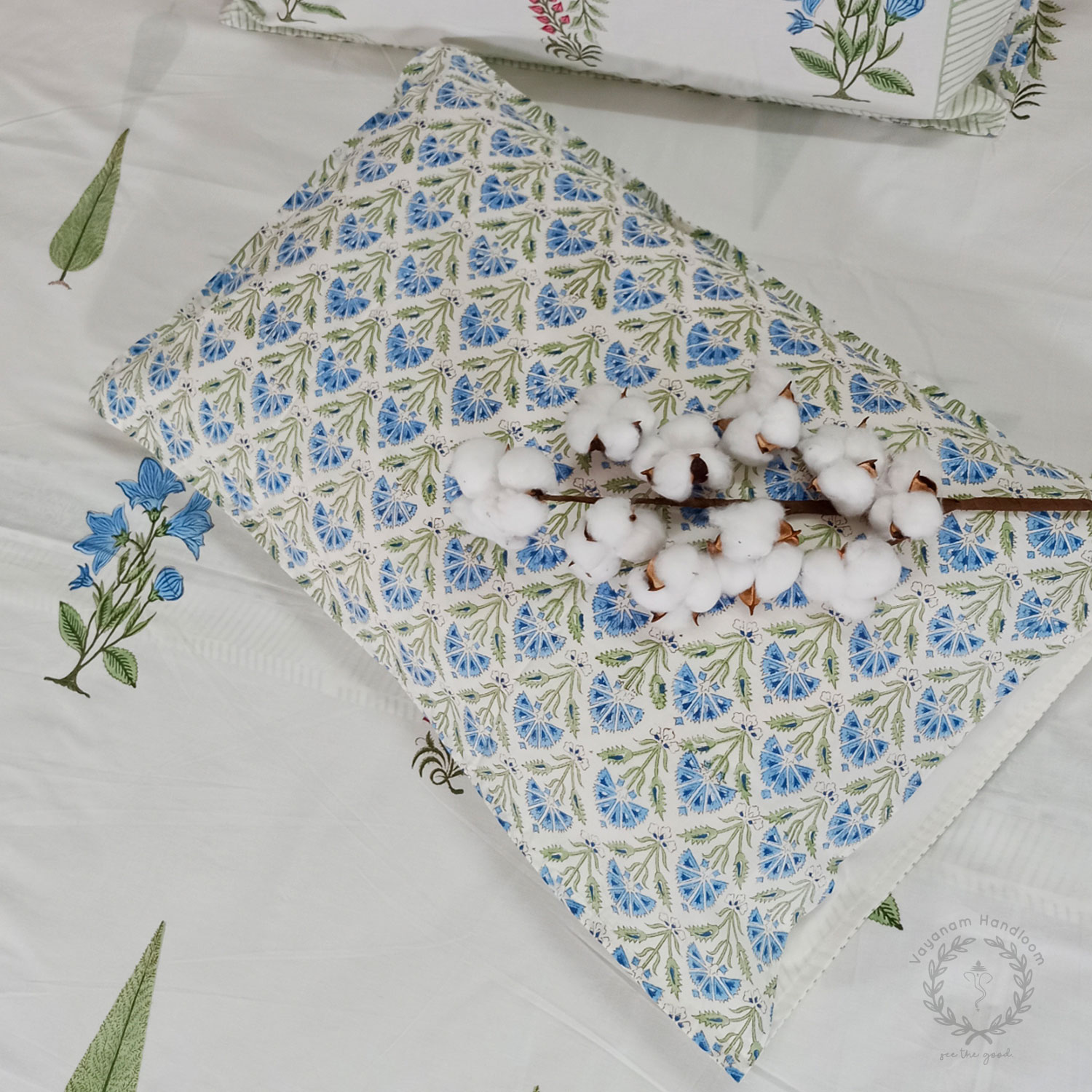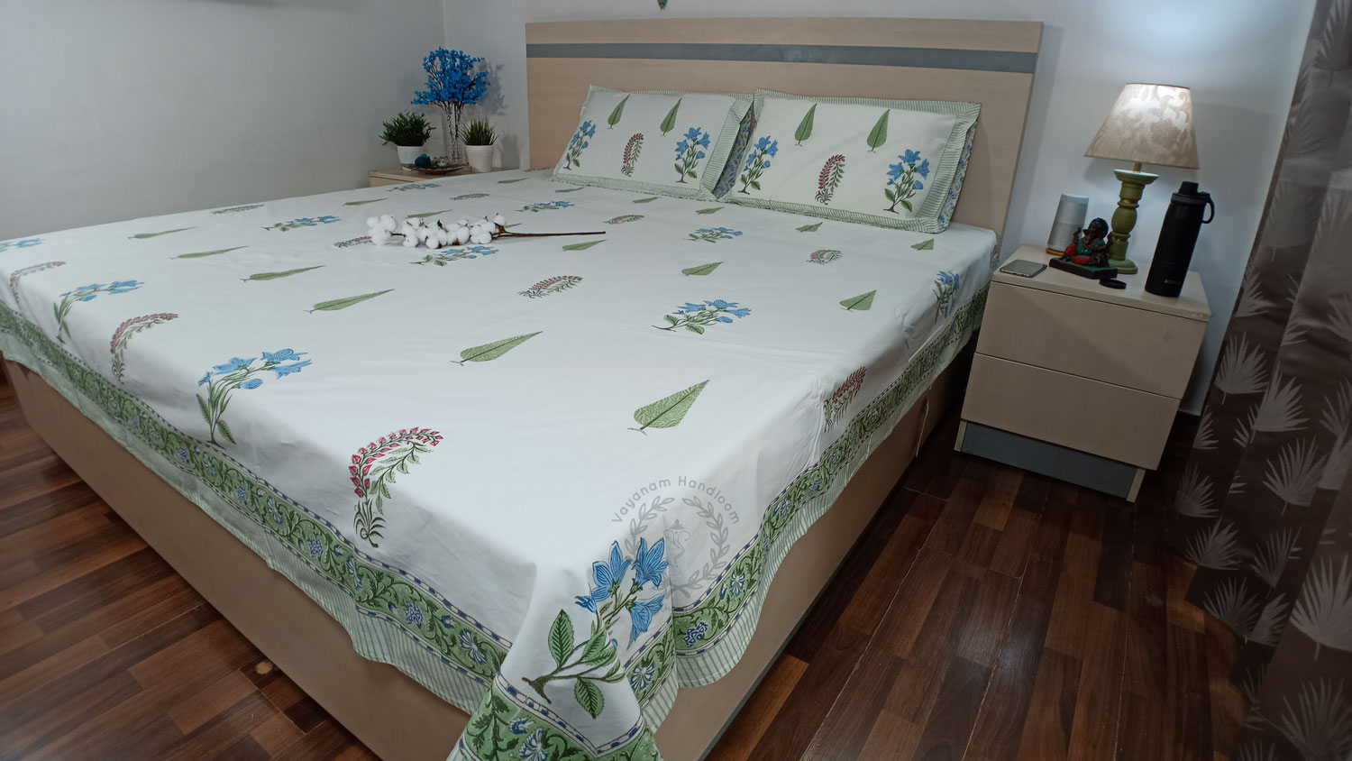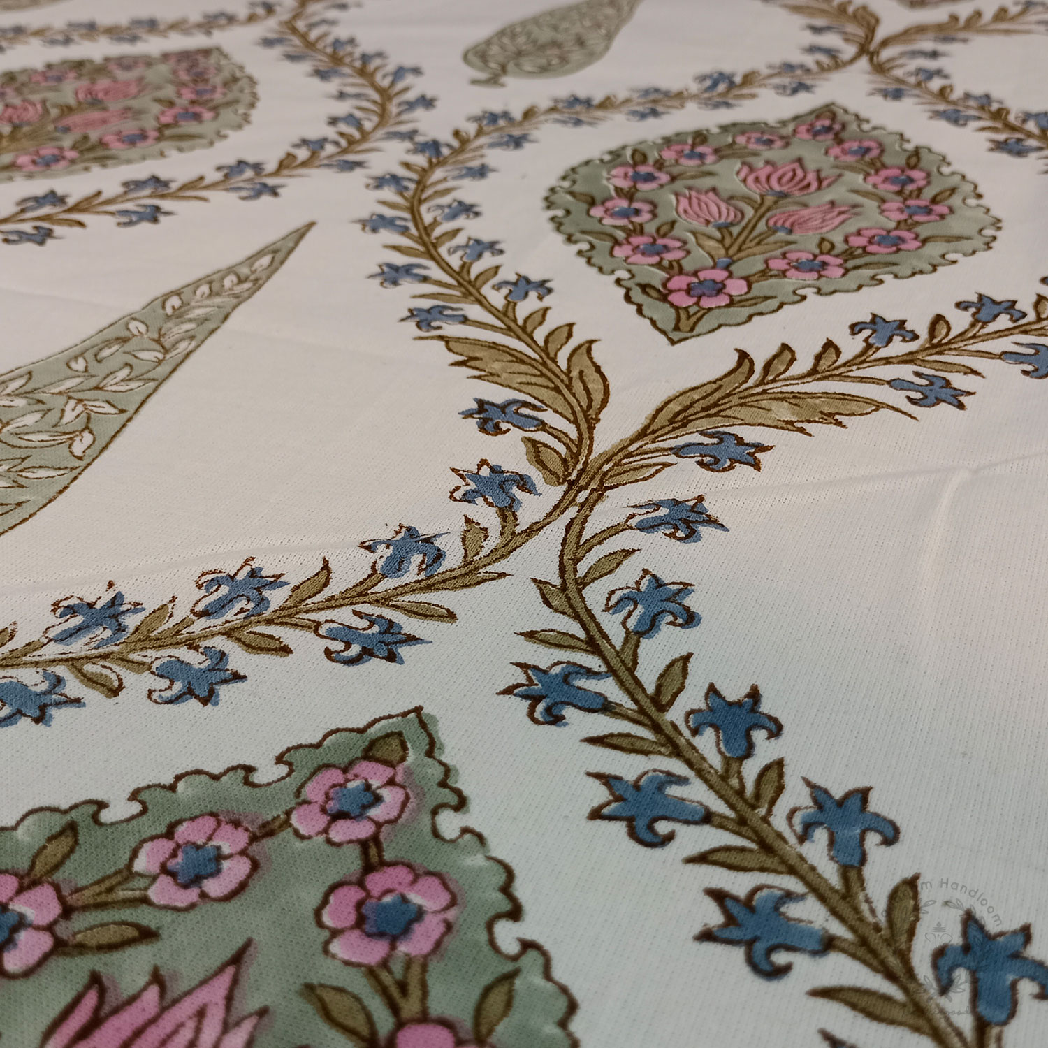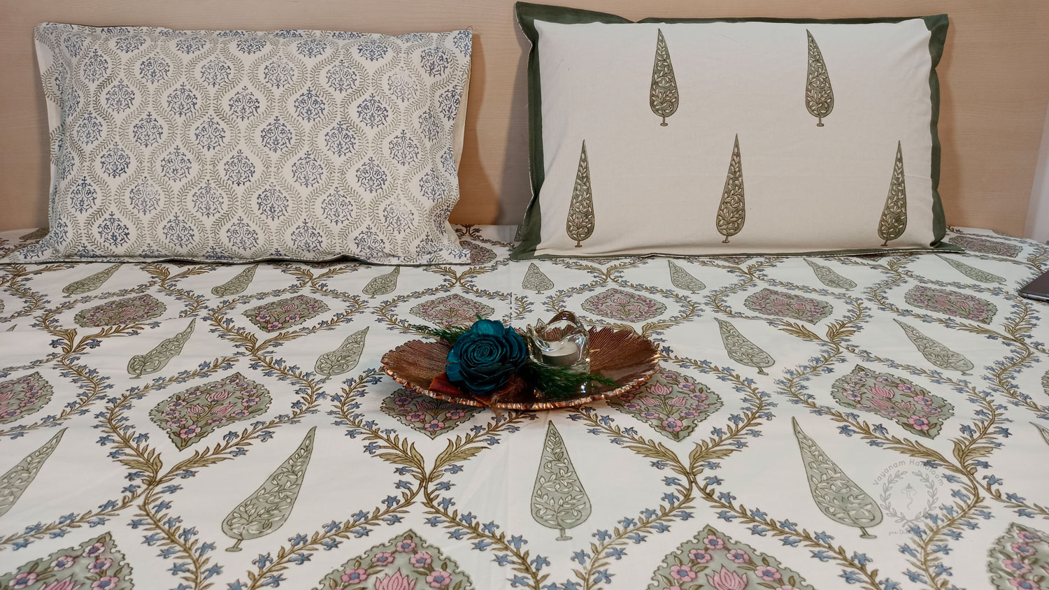 Kausheya Collection-Bedsheet with hand printed beautiful flowers and cypress in colour palatte of blue, pink and green