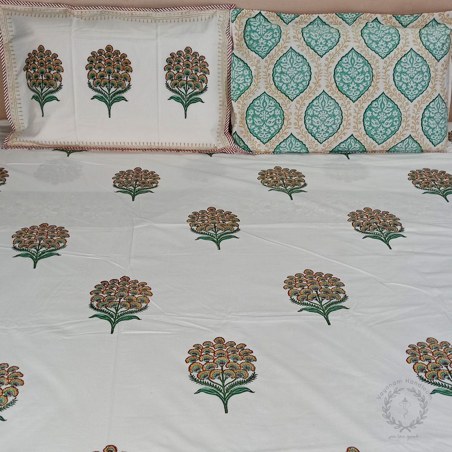 Kausheya Collection-Bedsheet with hand printed yellow flowers with red outline and green leaves