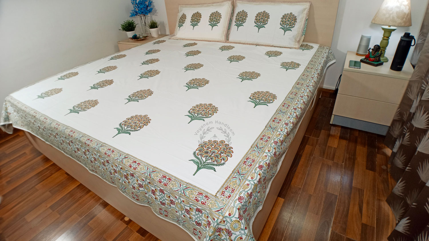 Shudham Collection- Hand block cotton bedsheet white and orange design