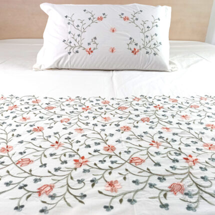 Kausheya Collection-Embroidered Bedsheet with Pillow Covers (Greyish Blue/Orange/Olive Green)