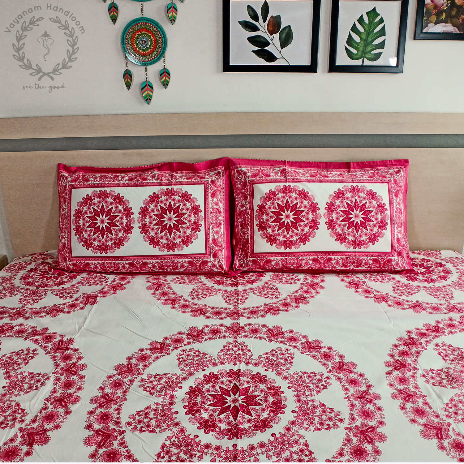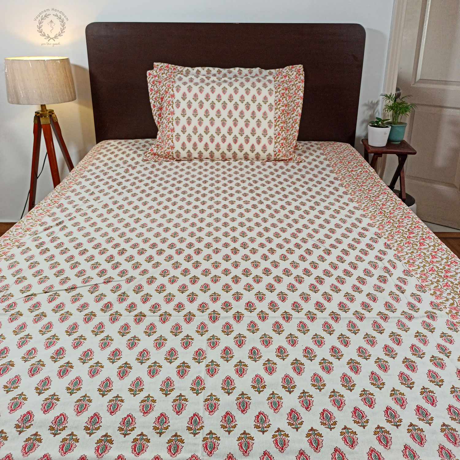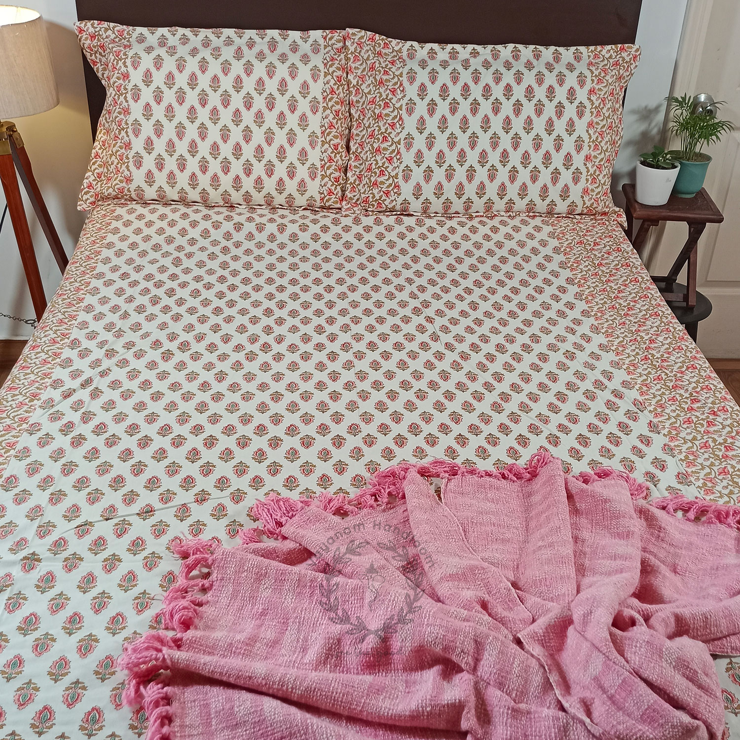 Shudham Collection- Hand block cotton bedsheet white and pink