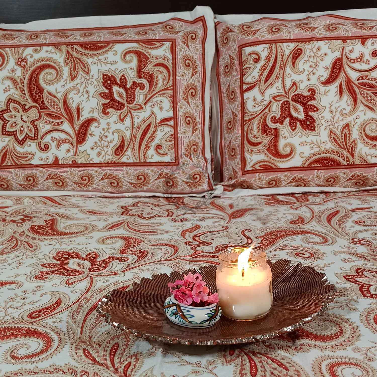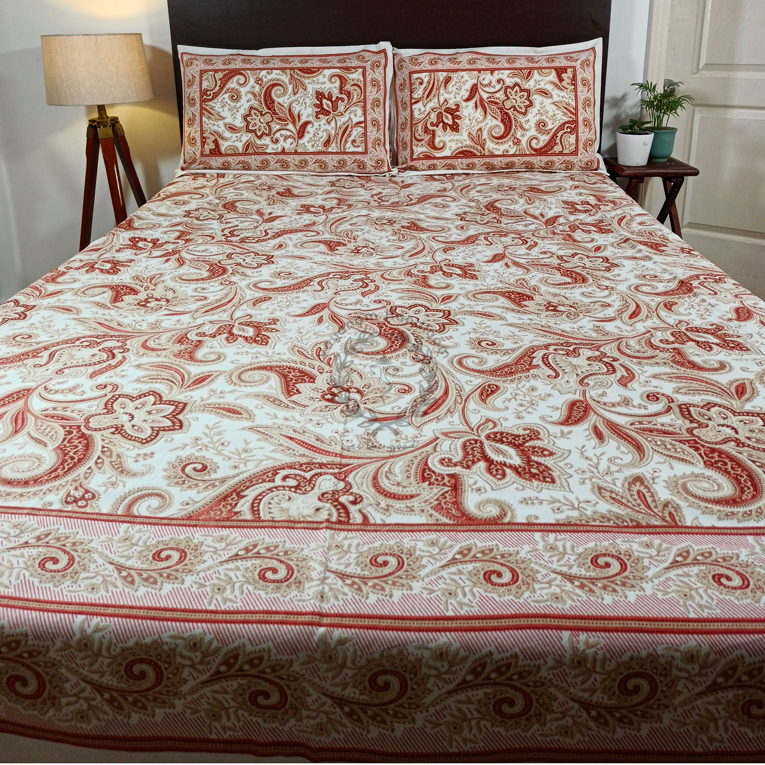 Shudham Collection- Hand block cotton bedsheet white and orange paisley motifs