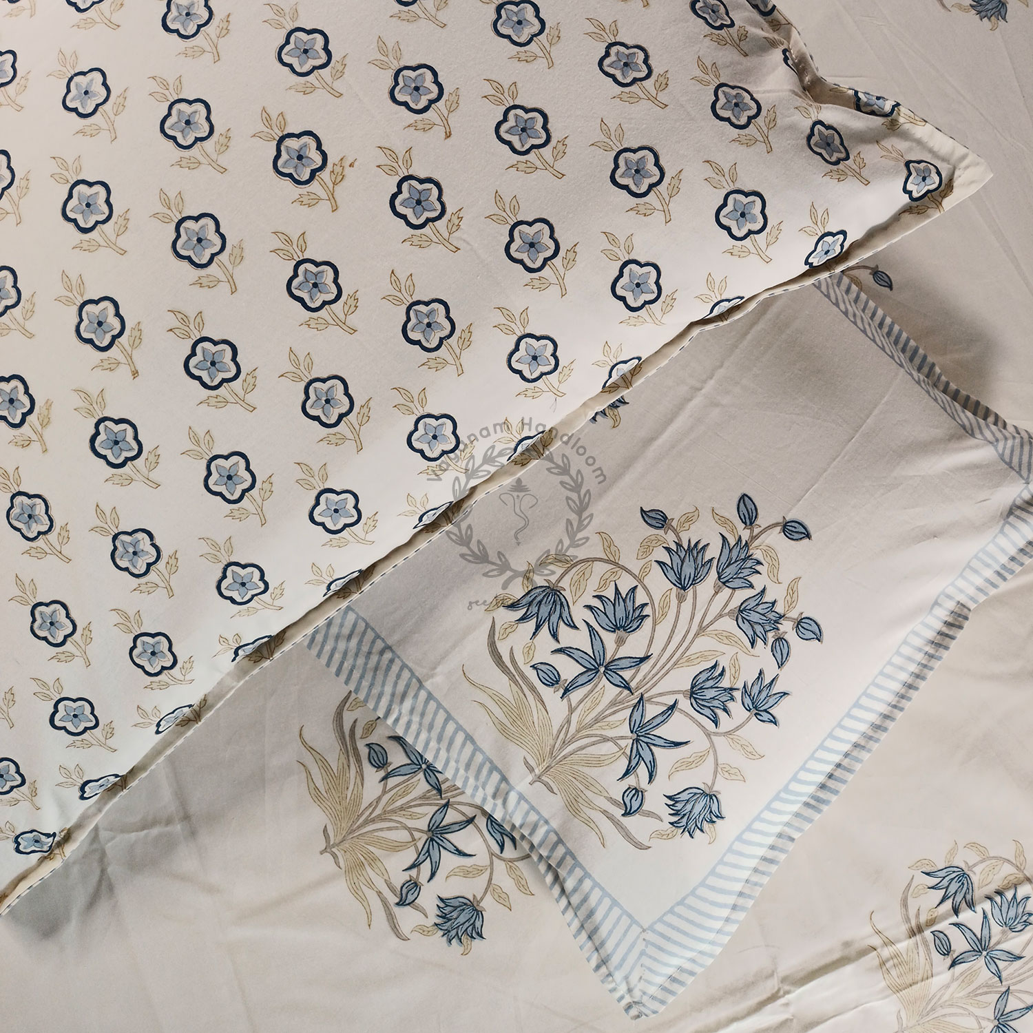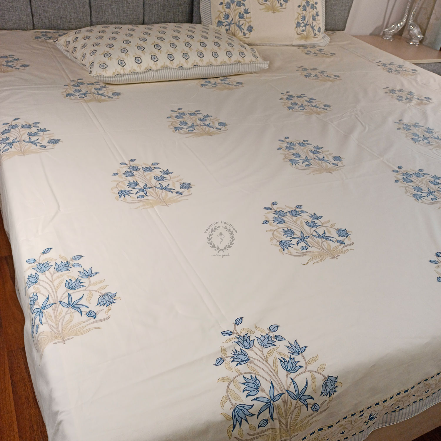 Shudham Collection- Hand block cotton bedsheet white and blue motifs