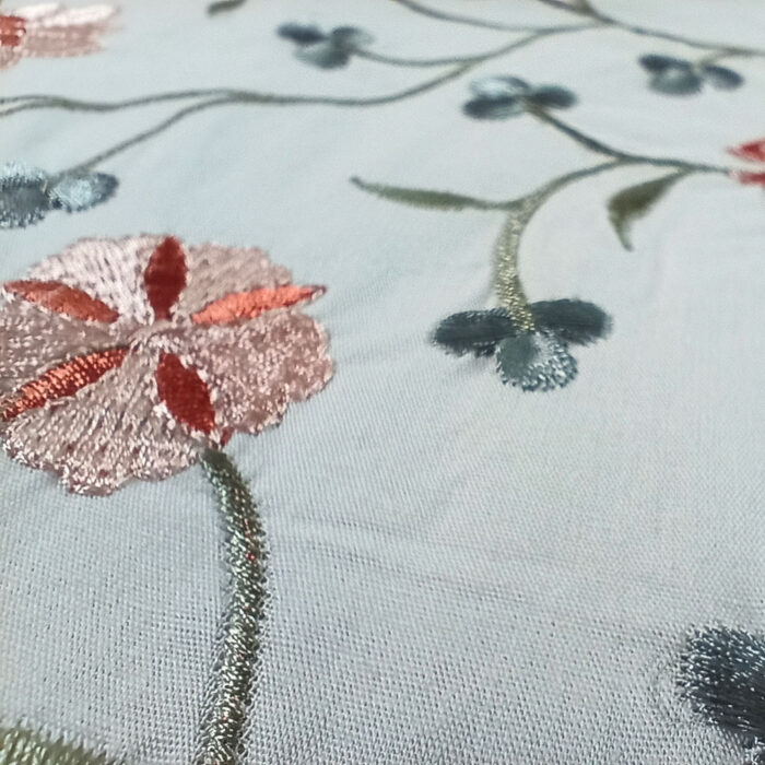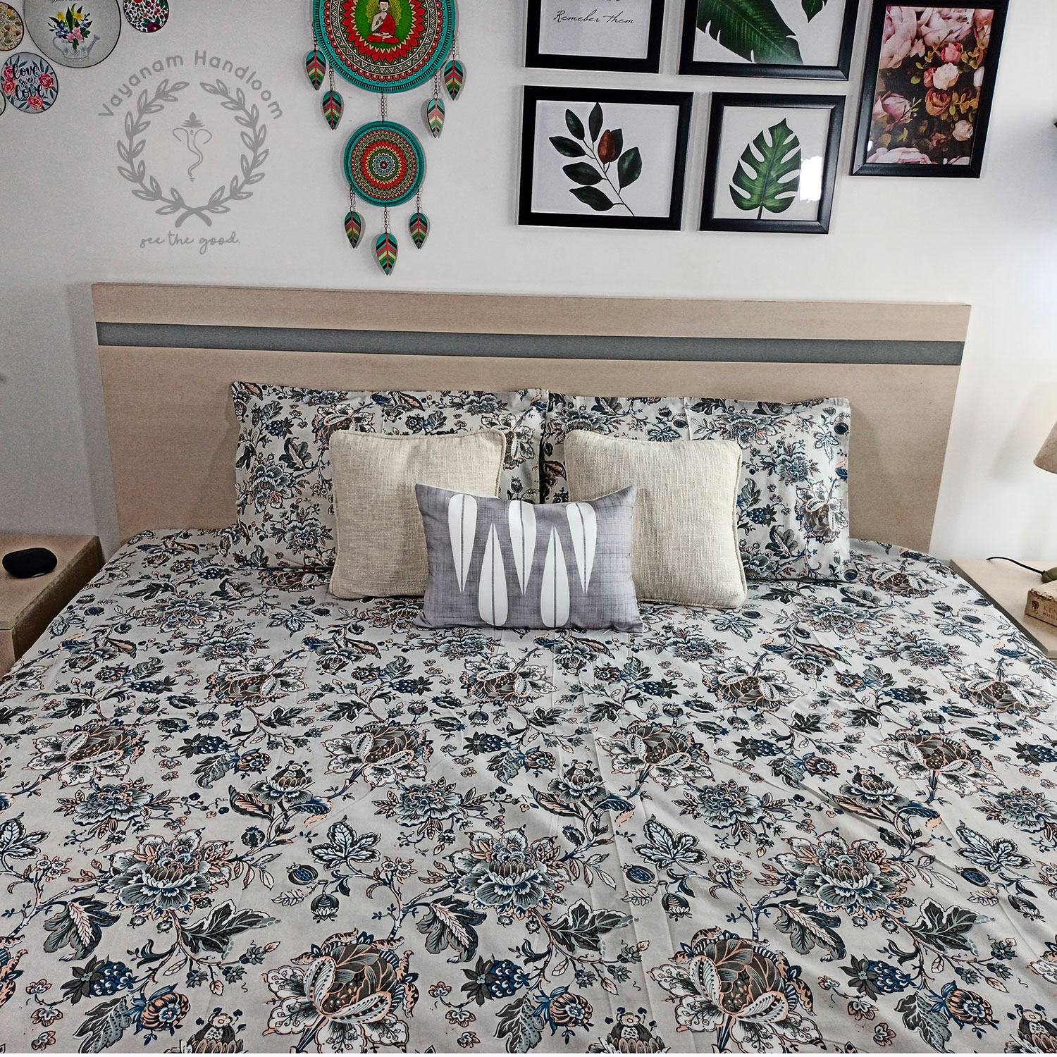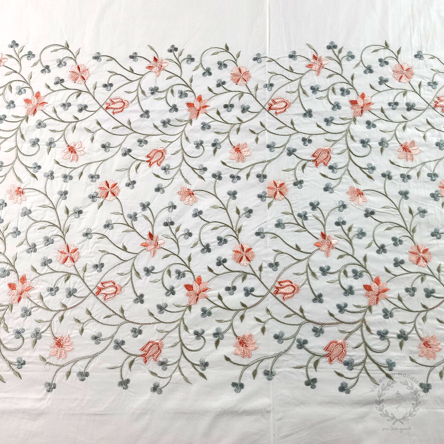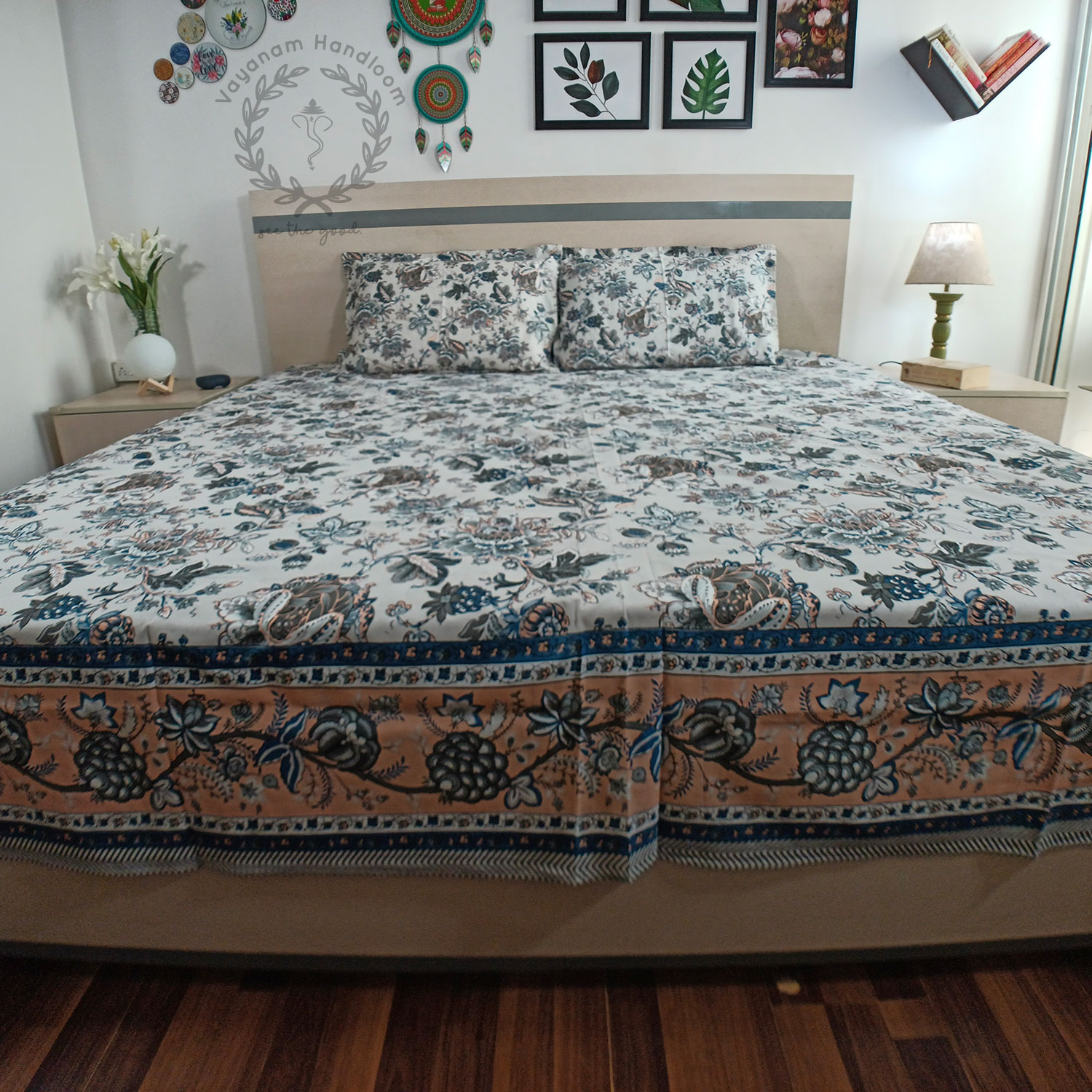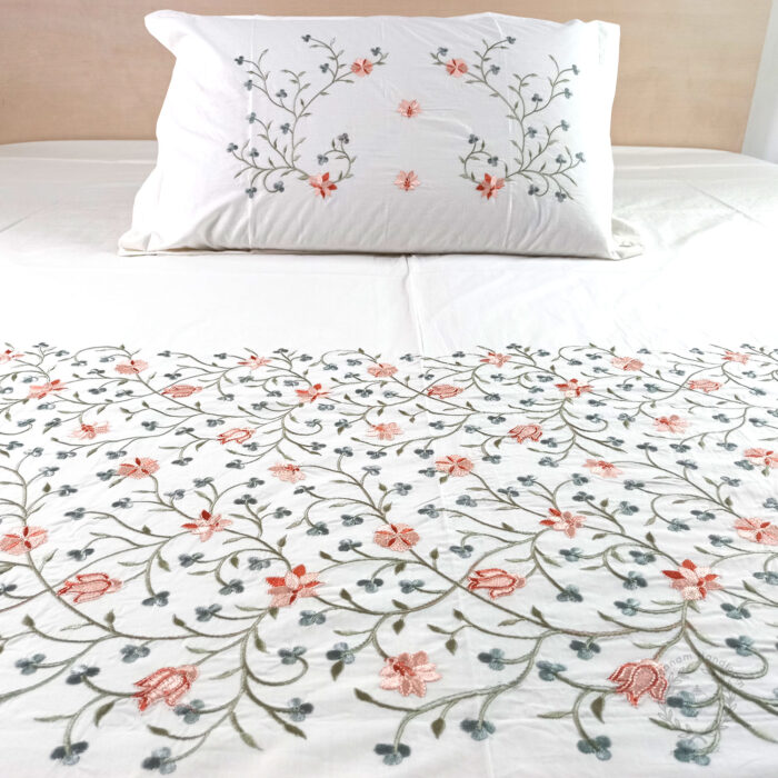 Add a touch of royalty to your bedroom with this beautifully embroidered bedsheet made from premium cotton fabric and embroidered with Greyish Blue, Orange and Olive Green thread.