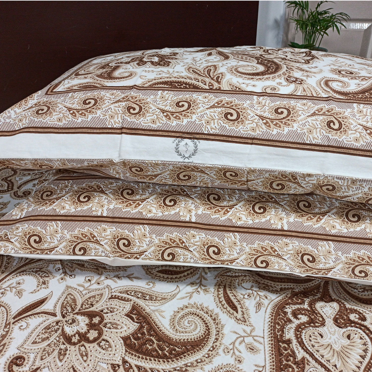 Artistically hand block printed bed sheet set complimented with the pillow covers with the motif-Paisley Design. Brown color has been used as borders to enhance the overall look of the bed sheet.