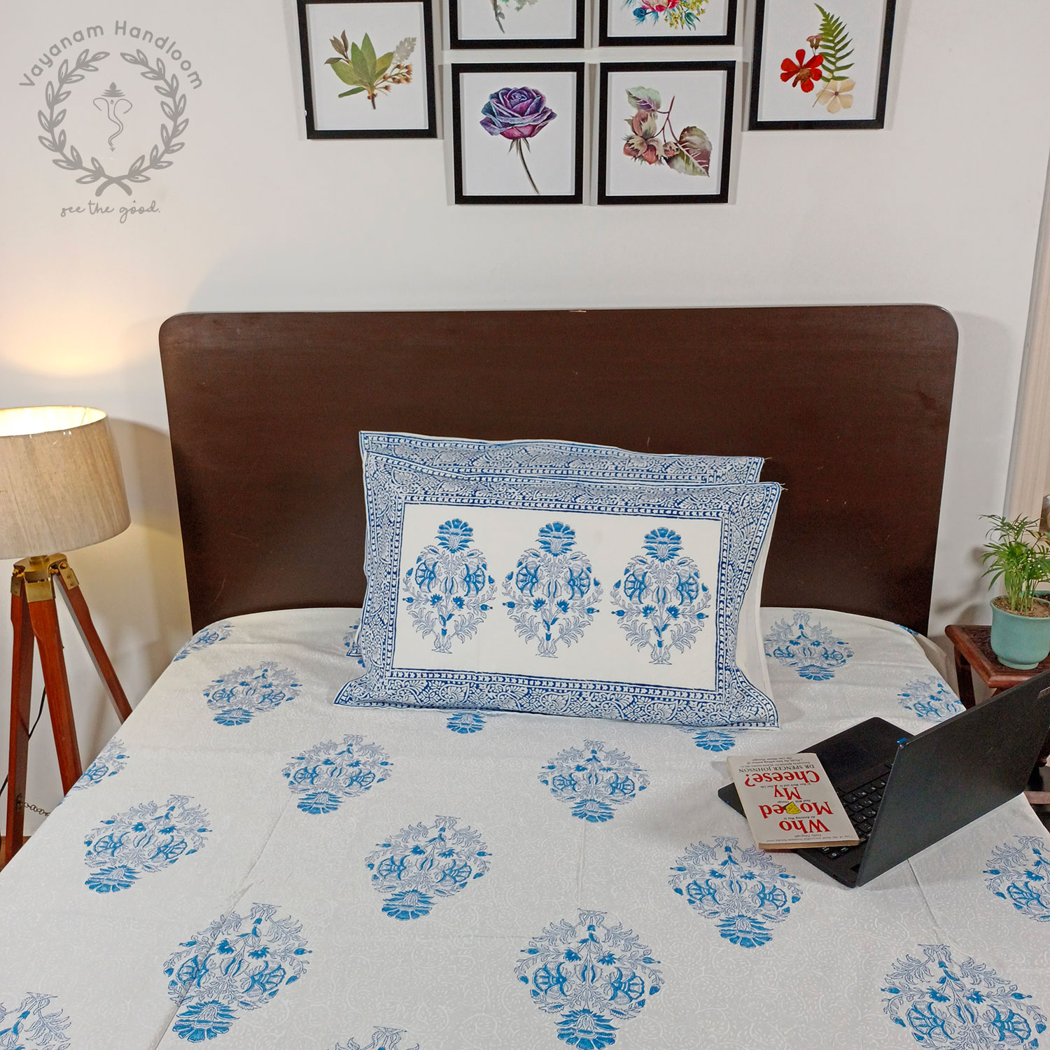 Artistically hand block printed bed sheet set complimented with the pillow covers with the motif-Flower Design. Light blue color has been used to enhance the overall look of our bed sheet.