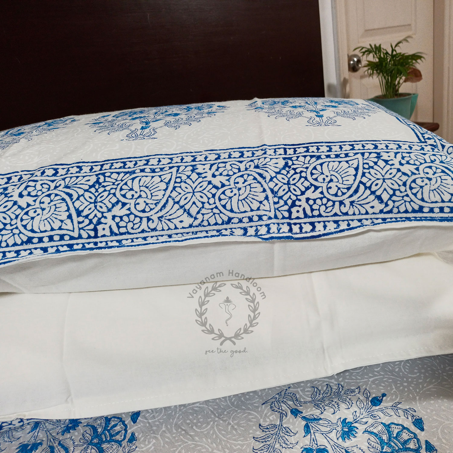 Shudham Collection- Hand block cotton bedsheet white and blue motifs