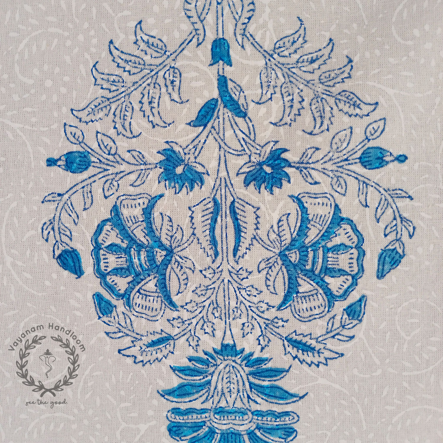 Shudham Collection- Hand block cotton bedsheet white and light blue motifs