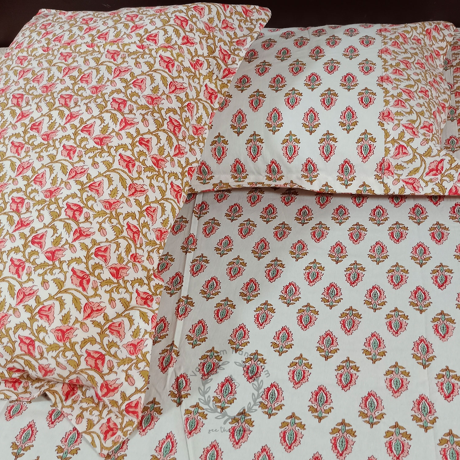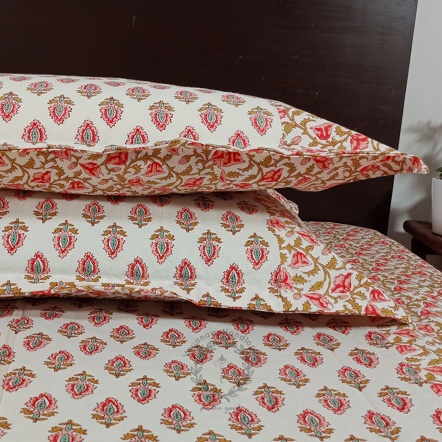 Artistically hand block printed bed sheet set complimented with the pillow covers with the motif-Flower Design. Orange color has been used as borders to enhance the overall look of the bed sheet.