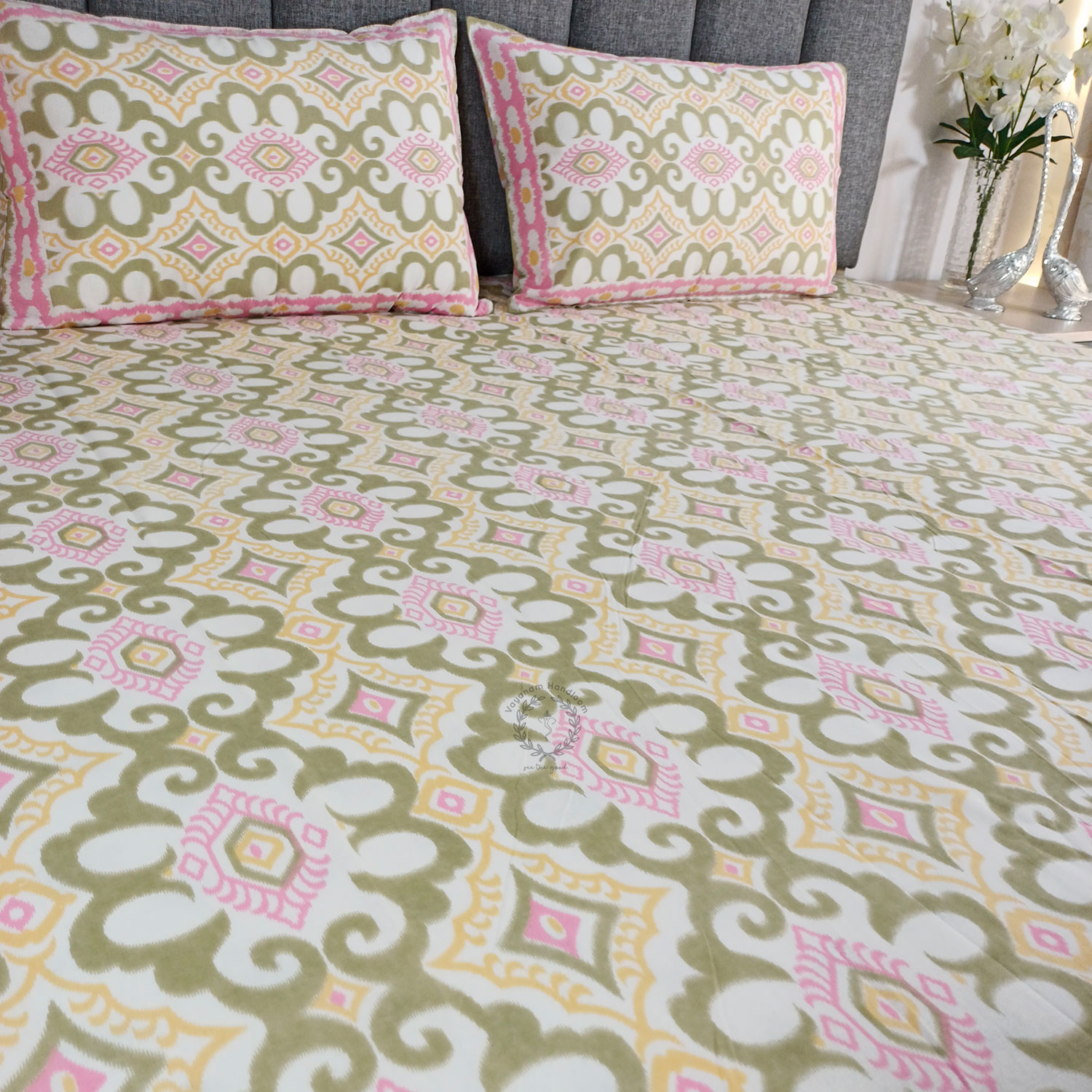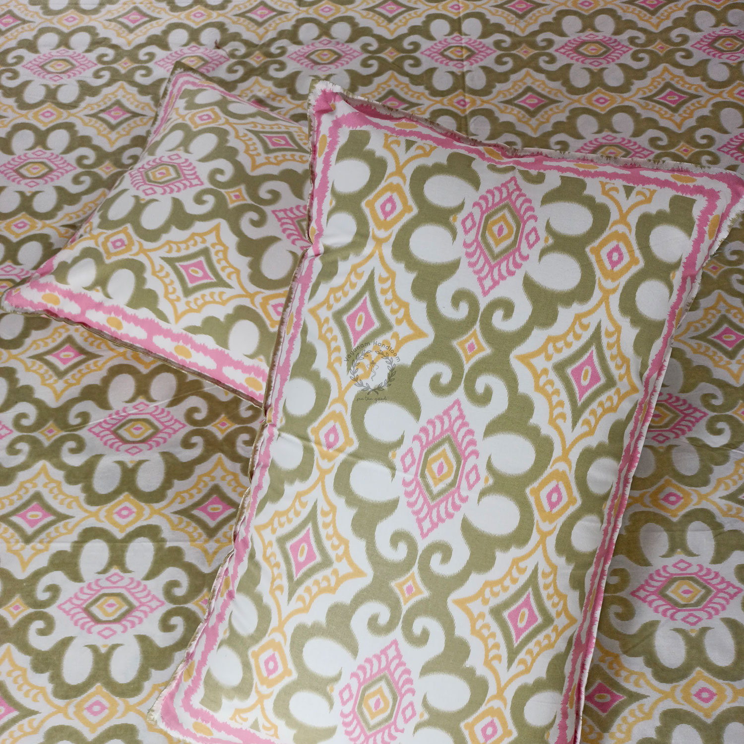 IKAT-Handblock Printed Bedsheet With 2 Reversible Pillow Covers