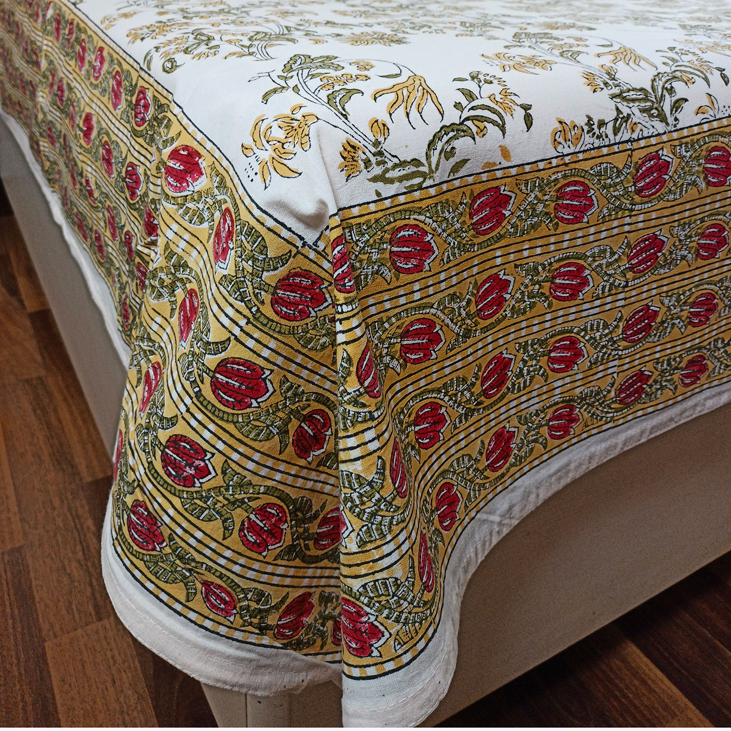 Yellow Flowers Block Printed Beige Cotton Bedsheet