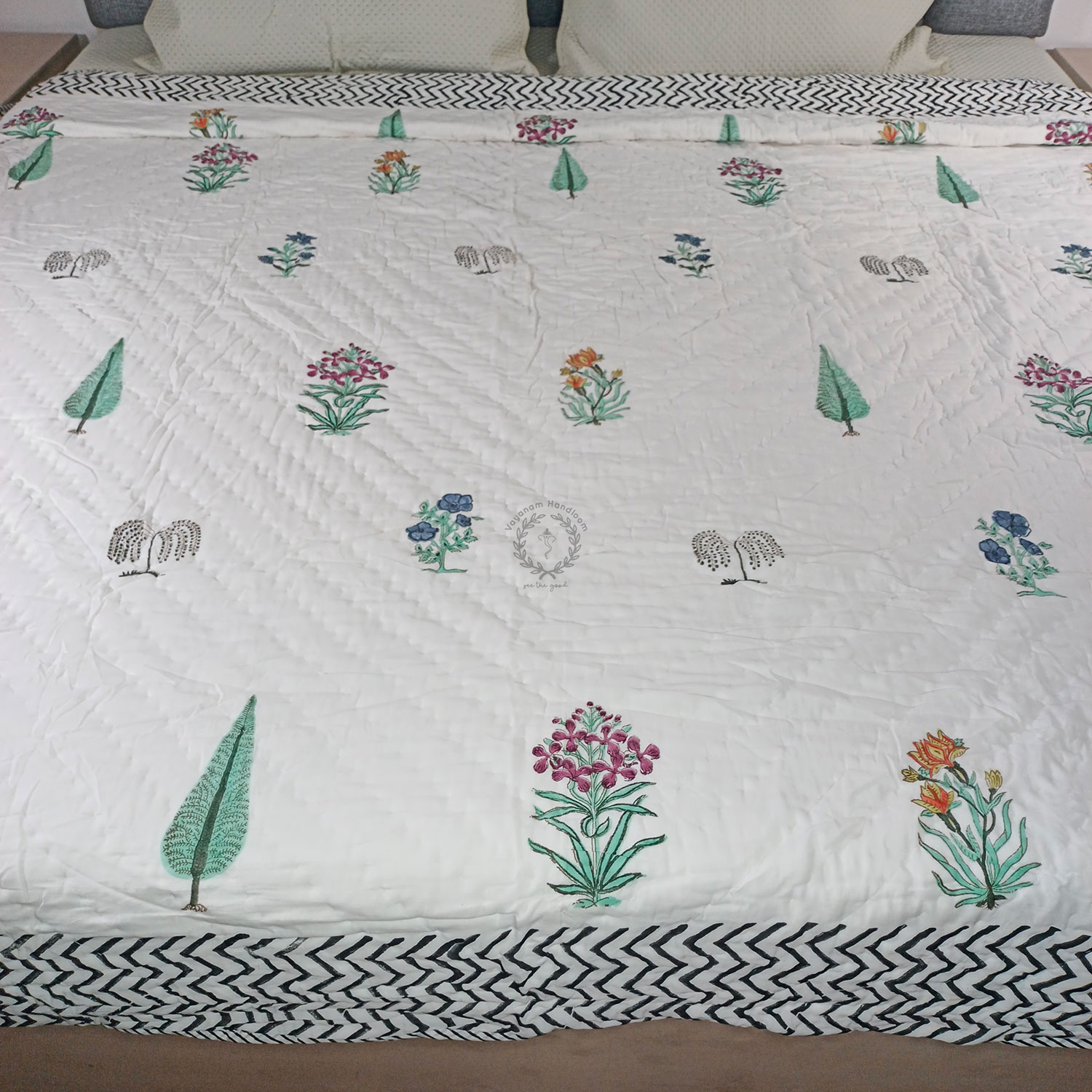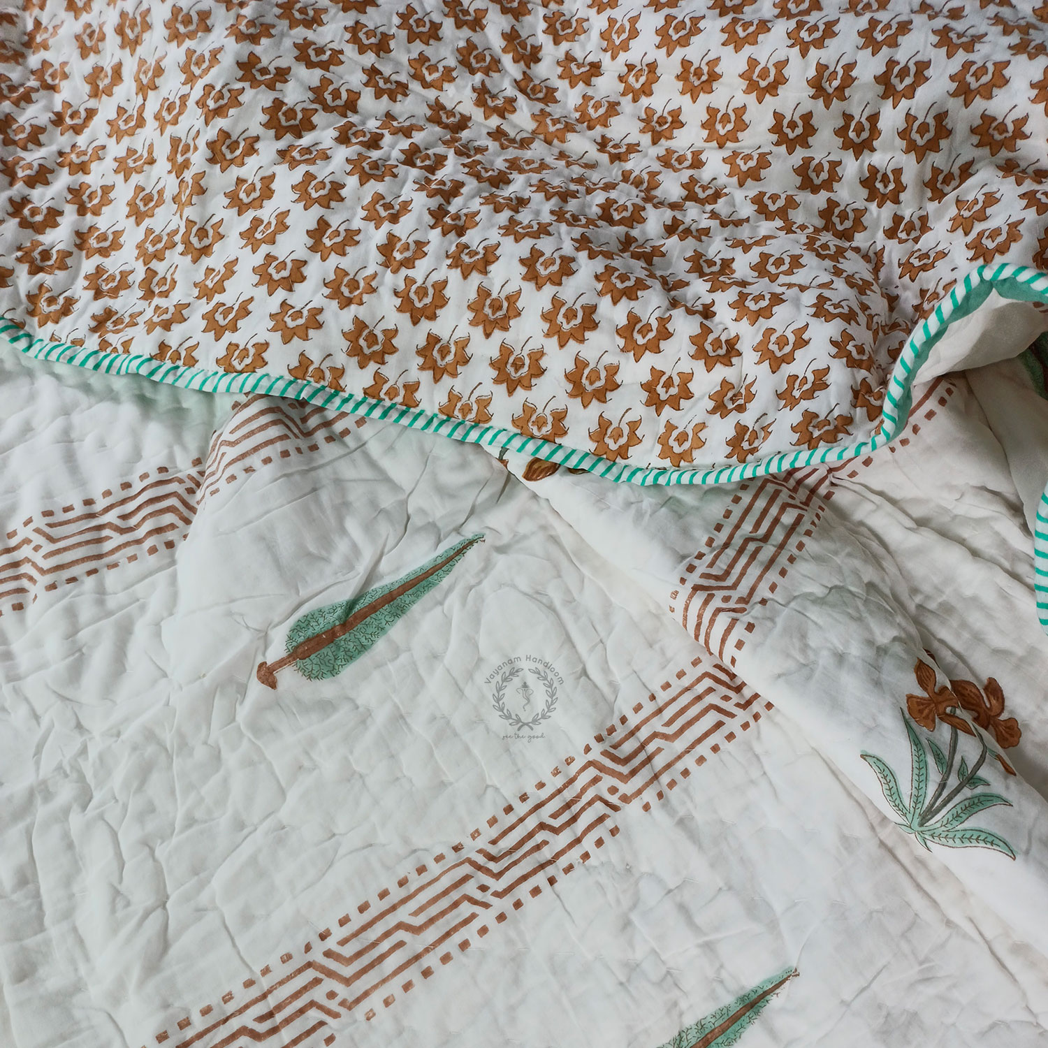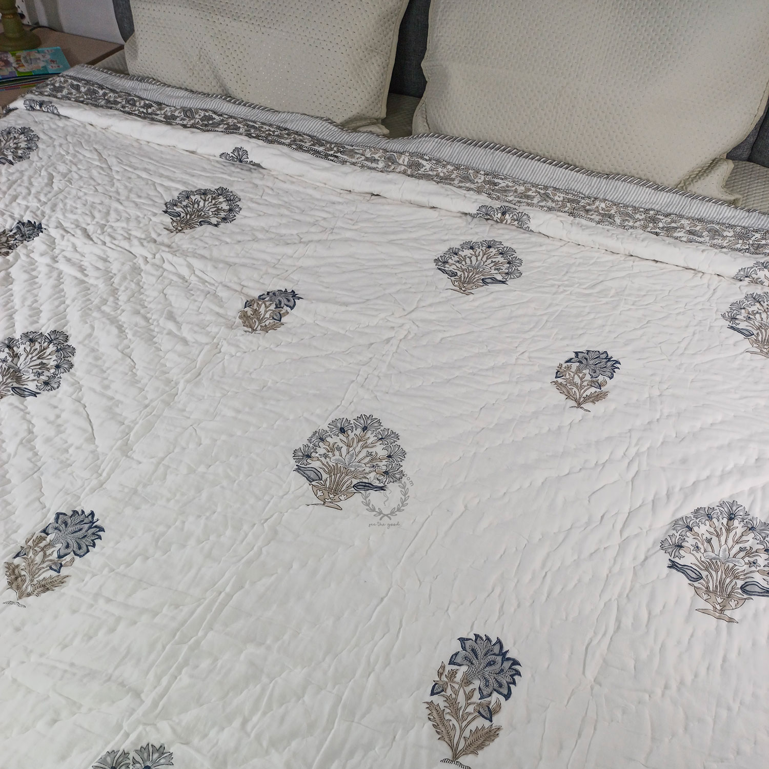 Enhance your bedroom interior with this handblock printed comforter. The design pattern is stamped by hand on a soft premium cotton fabric with hand-carved wood blocks dipped in natural vegetables dyes.
