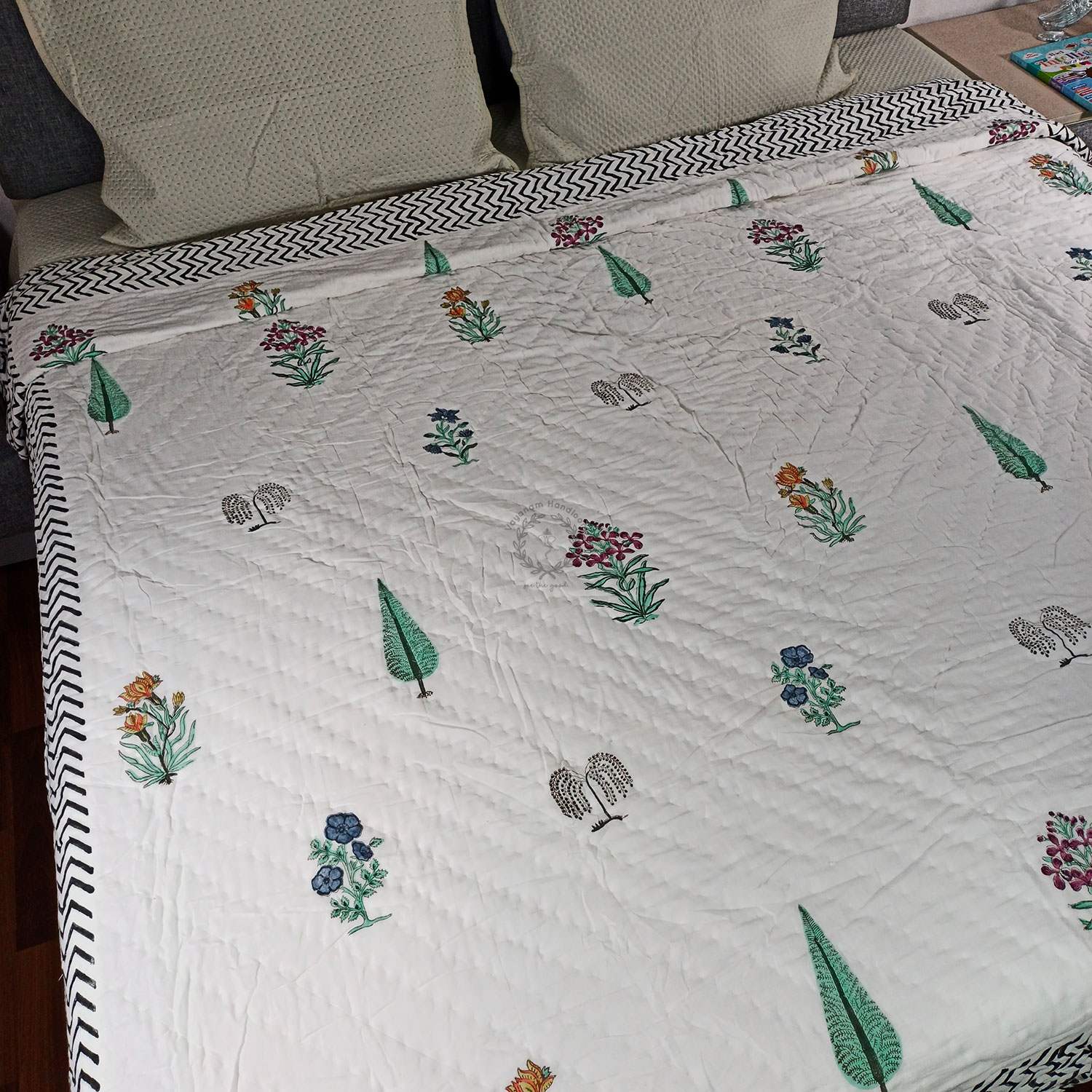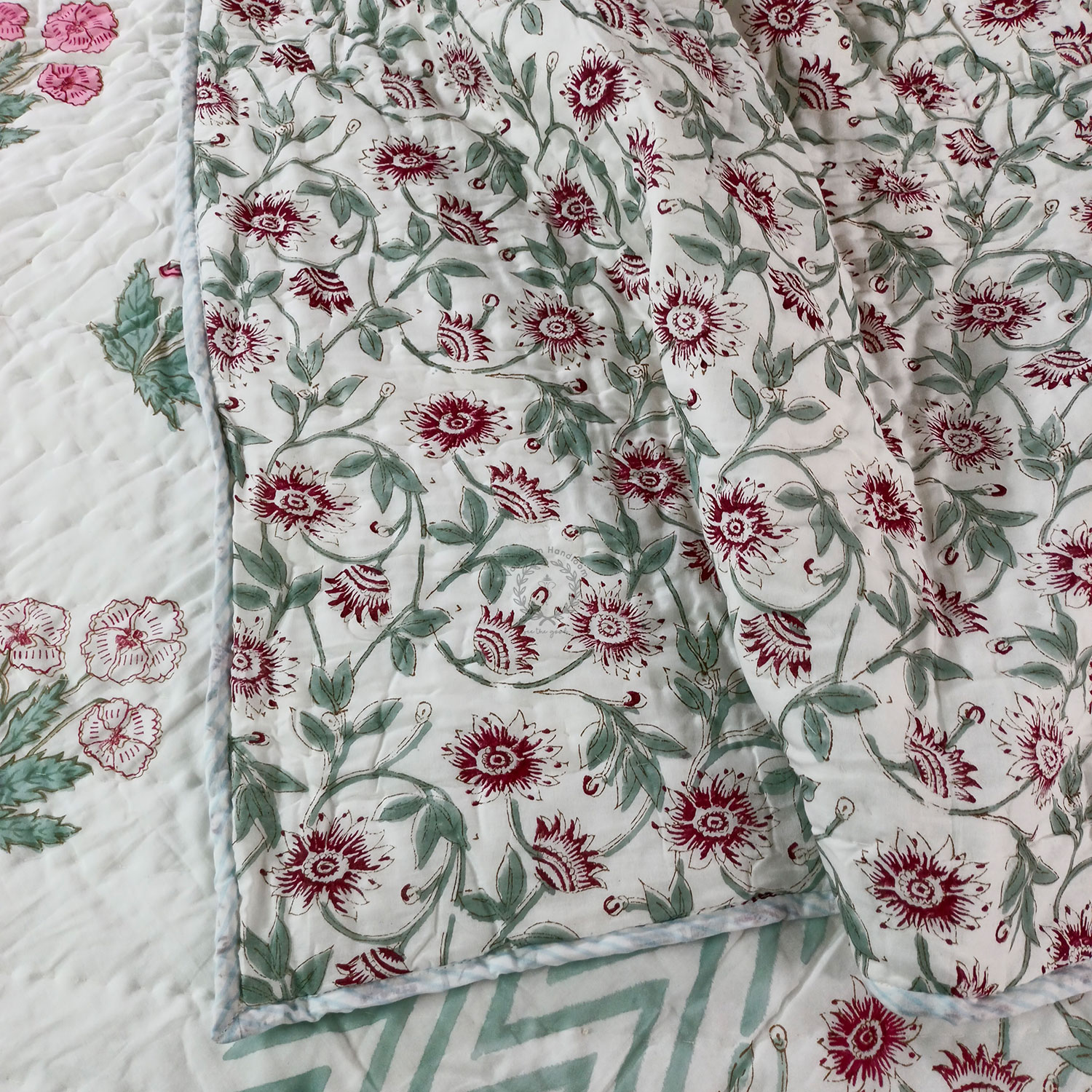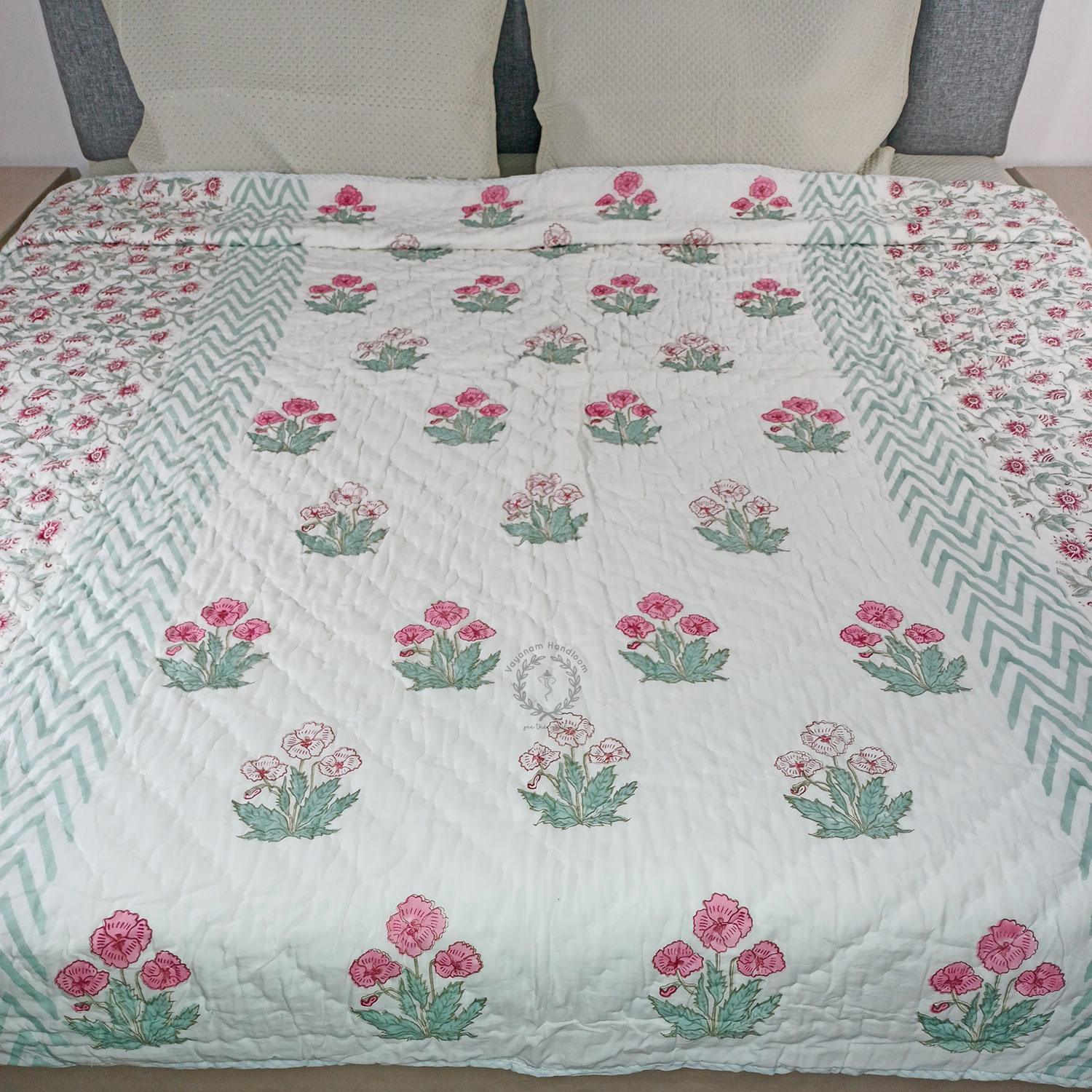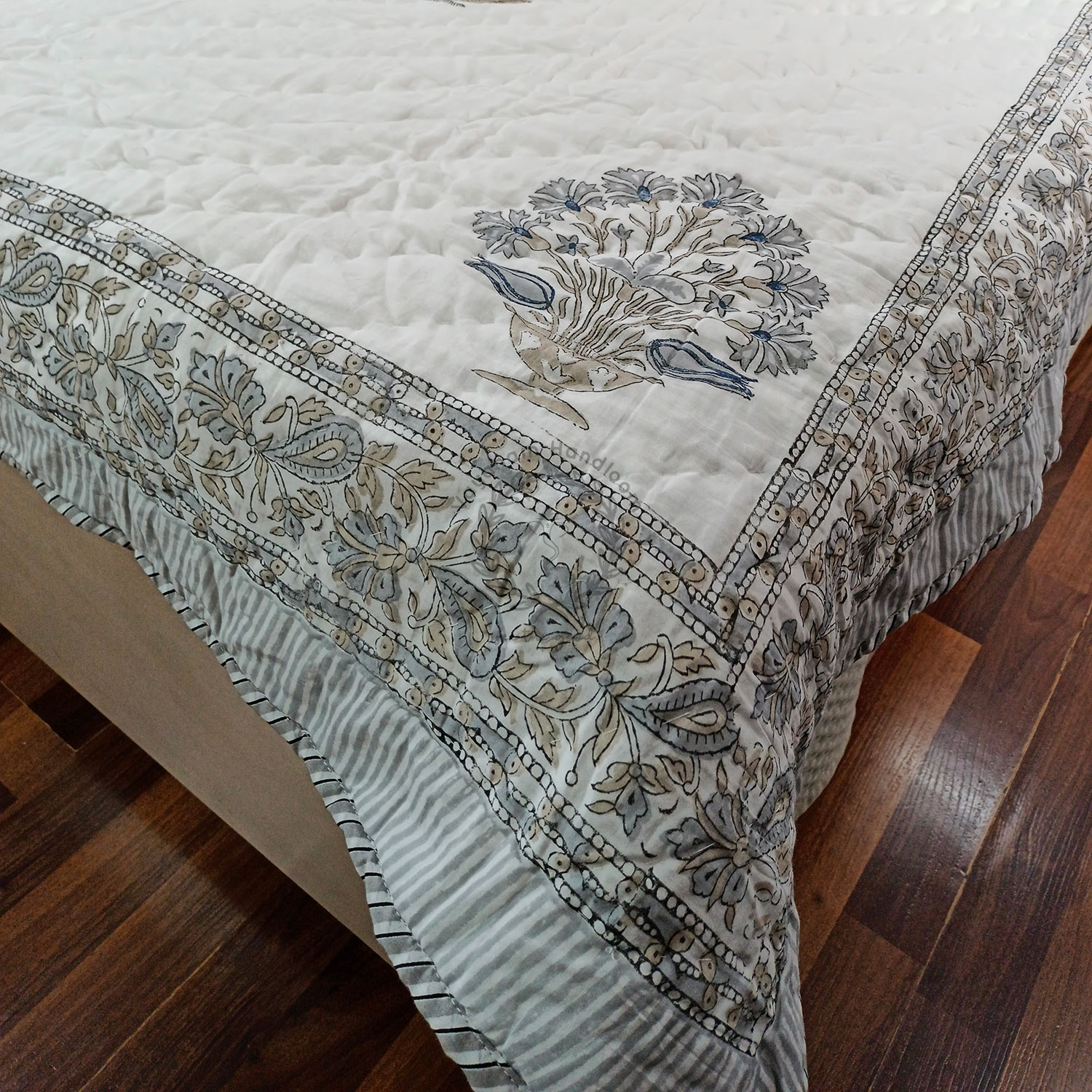 Enhance your bedroom interior with this handblock printed comforter. The design pattern is stamped by hand on a soft premium cotton fabric with hand-carved wood blocks dipped in natural vegetables dyes.